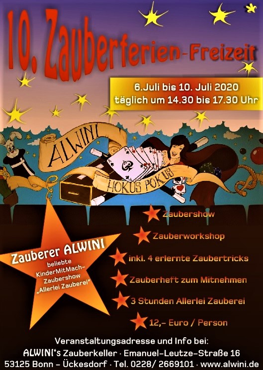 Die beliebte KinderMITMACH-Zaubershow (Dauer ca. 1 Stunde) sowie ein anschließender Kurzworkshop Zaubern lernen mit ALWINI (Dauer ca. 90 Minuten)